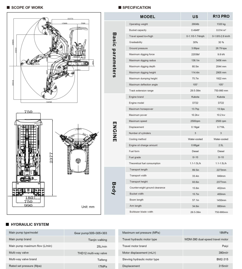 R13 mini gravemaskine er designet til at levere høj ydeevne trods sin kompakte størrelse. Med en gravekraft på 9,8 kN og en maksimal gravedybde på 1843 mm kan denne kompakte gravemaskine håndtere langt flere opgaver, end størrelsen antyder.