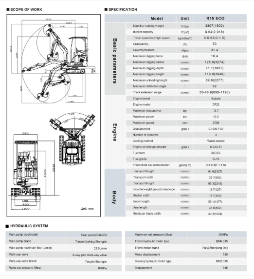 R15 ECO er en robust minigraver med en arbejdsvægt på 1500 kg, ideel til krævende bygge- og anlægsopgaver. Med en gravedybde på 1,84 meter og en økonomisk Kubota-dieselmotor leverer den både effektivitet og kraft. Perfekt til præcist og alsidigt arbejde på byggepladsen.